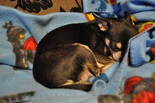 Neljältä minulla olikin kampaaja ja otin Pojun mukaan, jotta osaisi olla välillä yksinkin, vaikka olihan sillä seuraa kampaajallakin, koska siellä oli kampaajani koira Tipsu :) Poju väsyi nopeasti ja kun hiuksiani pestiin, se nukkui jaloissani ja leikkauksen ajan se nukkui sylissäni :)